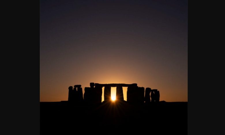 در این عکس، گوی بزرگ و درخشان خورشید 4.5 میلیارد ساله را می توان در حال غروب از میان صخره هایی مشاهده کرد که دقیقاً 4500 سال پیش در یک راستا قرار داشتند.