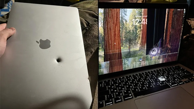 کاربری با نام @lanevychs در شبکه اجتماعی X با انتشار این تصاویر، بهصورت کنایهآمیز درباره میزان حفاظت بالستیکی مک بوک سوال کرده است؛ چرا که دستگاه او پس از اصابت ترکش گلوله، همچنان کار میکند!