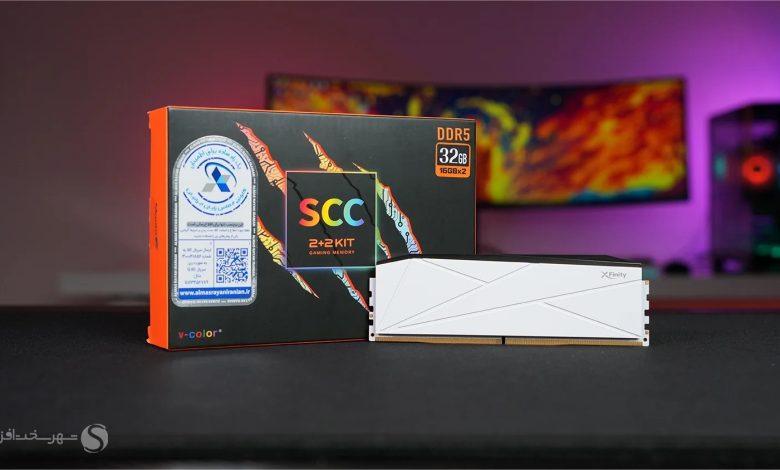 نمونه مورد بررسی، کیت حافظه V-Color Manta XFinity RGB SCC 2+2 CKD با ظرفیت 32 گیگابایت (2×16GB) است که بر پایه استاندارد DDR5 CU-DIMM طراحی شده و به تراشه Clock Driver مجهز است. این کیت تحت پروفایل XMP با فرکانس 8000 مگاهرتز، تایمینگ CL38-48-48-128 و ولتاژ 1.45 ولت فعالیت میکند و در عمل جزء سریعترین ماژولهای DDR5 موجود در بازار به حساب میآید.